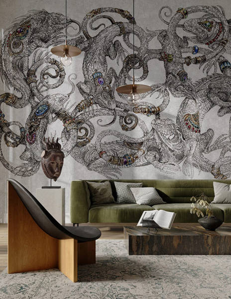 Modne wzornictwo oraz kolorystyka to właśnie znajdziemy w muralach firmy Wonderwall. Całym smaczkiem fototapety jest nierównomierne ubarwienie, który nadaje klimat.