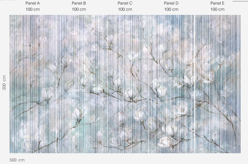 Murale marki Wonderwall sprzedajemy w rolkach o standardowych wymiarach: 100 cm x 300 cm. Jeśli wysokość waszego pomieszczenia jest mniejsza niż 3 metry, wówczas nadmiar tapety należy w odpowiednim miejscu odciąć. Na pełny wzór składa się pięć rolek: a, b, c, d i e. Można wybrać konkretne rolki dopasowując tapetę do swojego wnętrza. Lub można przygotować mural pod konkretny wymiar. W tym celu prosimy o kontakt pod mail sklep@iguane.pl