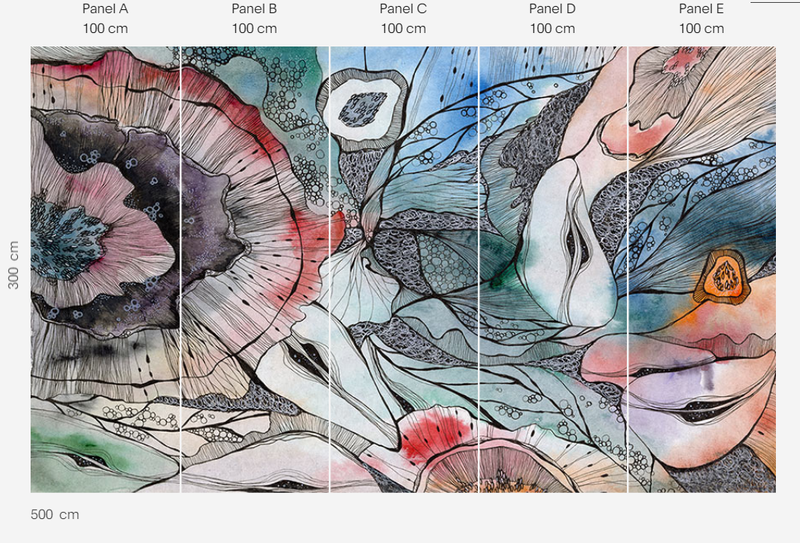 Murale marki Wonderwall sprzedajemy w rolkach o standardowych wymiarach: 100 cm x 300 cm. Jeśli wysokość waszego pomieszczenia jest mniejsza niż 3 metry, wówczas nadmiar tapety należy w odpowiednim miejscu odciąć. Na pełny wzór składa się pięć rolek: a, b, c, d i e. Można wybrać konkretne rolki dopasowując tapetę do swojego wnętrza. Lub można przygotować mural pod konkretny wymiar. W tym celu prosimy o kontakt pod mail sklep@iguane.pl