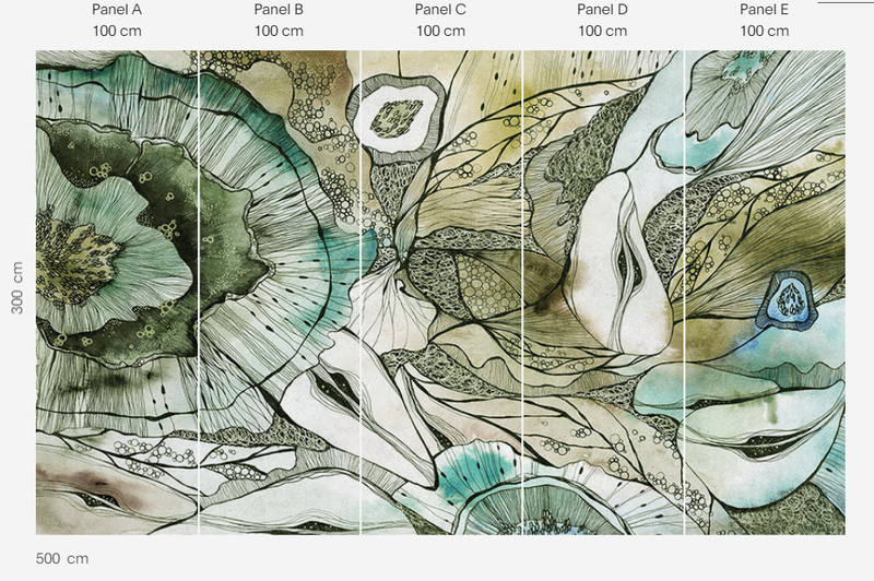 Murale marki Wonderwall sprzedajemy w rolkach o standardowych wymiarach: 100 cm x 300 cm. Jeśli wysokość waszego pomieszczenia jest mniejsza niż 3 metry, wówczas nadmiar tapety należy w odpowiednim miejscu odciąć. Na pełny wzór składa się pięć rolek: a, b, c, d i e. Można wybrać konkretne rolki dopasowując tapetę do swojego wnętrza. Lub można przygotować mural pod konkretny wymiar. W tym celu prosimy o kontakt pod mail sklep@iguane.pl