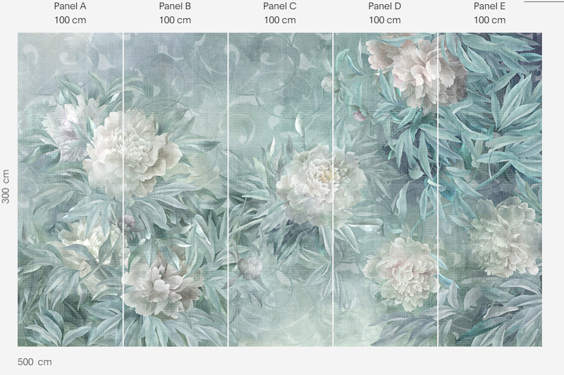 Murale marki Wonderwall sprzedajemy w rolkach o standardowych wymiarach: 100 cm x 300 cm. Jeśli wysokość waszego pomieszczenia jest mniejsza niż 3 metry, wówczas nadmiar tapety należy w odpowiednim miejscu odciąć. Na pełny wzór składa się pięć rolek: a, b, c, d i e. Można wybrać konkretne rolki dopasowując tapetę do swojego wnętrza. Lub można przygotować mural pod konkretny wymiar. W tym celu prosimy o kontakt pod mail sklep@iguane.pl