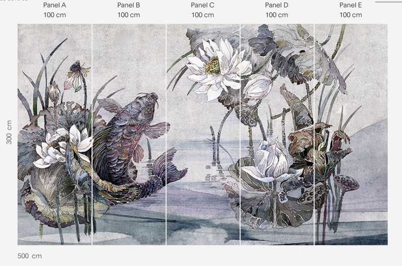 Murale marki Wonderwall sprzedajemy w rolkach o standardowych wymiarach: 100 cm x 300 cm. Jeśli wysokość waszego pomieszczenia jest mniejsza niż 3 metry, wówczas nadmiar tapety należy w odpowiednim miejscu odciąć. Na pełny wzór składa się pięć rolek: a, b, c, d i e. Można wybrać konkretne rolki dopasowując tapetę do swojego wnętrza. Lub można przygotować mural pod konkretny wymiar. W tym celu prosimy o kontakt pod mail sklep@iguane.pl