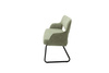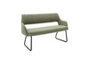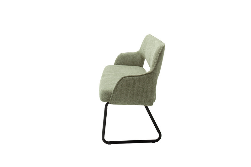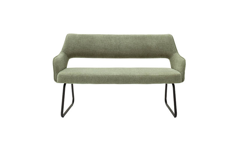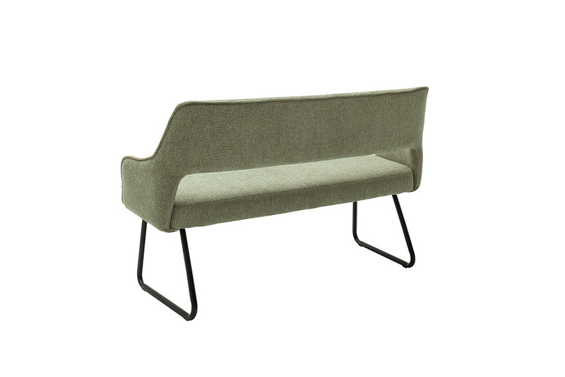 Lekka forma i miękka tkanina typu szenil świetnie sprawdzi się w nowoczesnych wnętrzach. Wygodę zapewniają sprężyny kieszeniowe w siedzisku. Ławka na płozach metalowych, lakierowanych na czarny mat.