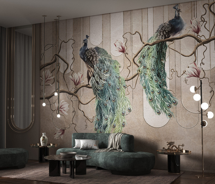 Mural Nollio przedstawia przepiękne pawie, siedzące na cudownych, kwiecistych gałęziach. Wyrafinowany, nastrojowy design w odcieniach szlachetnego, królewskiego koloru w połączeniu z majestatycznymi ptakami sprawi, że każde wnętrze będzie przytulne, ale i eleganckie. Mural będzie pasował zarówno do sypialni, salonu, kuchni, łazienki, przedpokoju czy pokoju dziecka. Idealne do wnętrz boho, naturalnych, klasycznych, skandynawskich i rustykalnych.