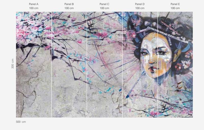 Murale marki Wonderwall sprzedajemy w rolkach o standardowych wymiarach: 100 cm x 300 cm. Jeśli wysokość waszego pomieszczenia jest mniejsza niż 3 metry, wówczas nadmiar tapety należy w odpowiednim miejscu odciąć. Na pełny wzór składa się pięć rolek: a, b, c, d i e. Można wybrać konkretne rolki dopasowując tapetę do swojego wnętrza. Lub można przygotować mural pod konkretny wymiar. W tym celu prosimy o kontakt pod mail sklep@iguane.pl