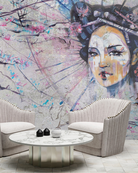 Głównym motywem tapety jest gejsza i gałązki kwitnącej wiśni. Całość wzoru tworzy spójną, harmonijną kompozycję.