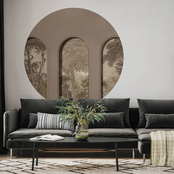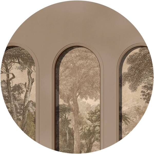 Wnętrze łuków to wzór Hood Light, który wprowadzi do wnętrza las w niezwykle eleganckim, nieco kolonialnym wydaniu. Widok nawiązujących do starych rycin przedstawia dziki, niezbrukany ludzką ręką starodrzew. Ciepłe zielenie i tło lekko stylizowane na stare ryciny, będą idealnym uzupełnieniem zarówno drewnianych mebli jak i przełamaniem nowoczesnych beży. Perspektywa uchwycona w pejzażu sprawi, że wnętrze nabierze głębi i optycznie się powiększy.