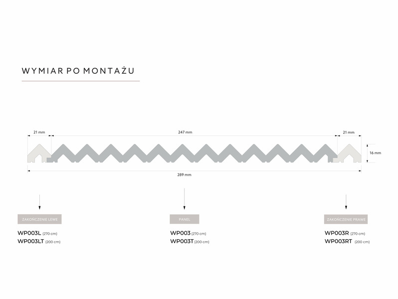 Dedykowane do stosowania z prawej strony panela ściennego z tej samej kolekcji. Zakończenie WP003R jest produkowane z tworzywa PolyForce, czyli cechuje się wysoką wytrzymałością na uszkodzenia mechaniczne i pełną wodoodpornością. Można je zastosować we wszystkich rodzajach pomieszczeń, również tych narażonych na silne nasłonecznienie czy wysoki poziom wilgotności. Zakończenie WP003R zostało pokryte specjalnym primerem, który umożliwia bezproblemowe pokrycie powierzchni farbą na bazie wody w dowolnym kolorze.