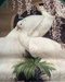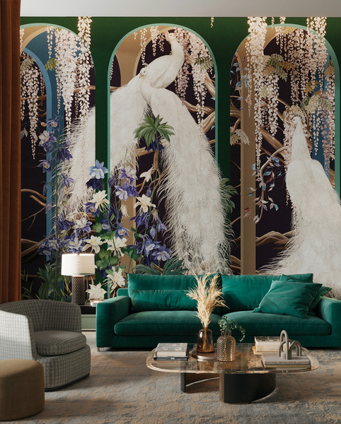Głównym motywem tapety są kwiaty, gałęzie i białe pawie. Całość wzoru tworzy spójną, harmonijną kompozycję.
