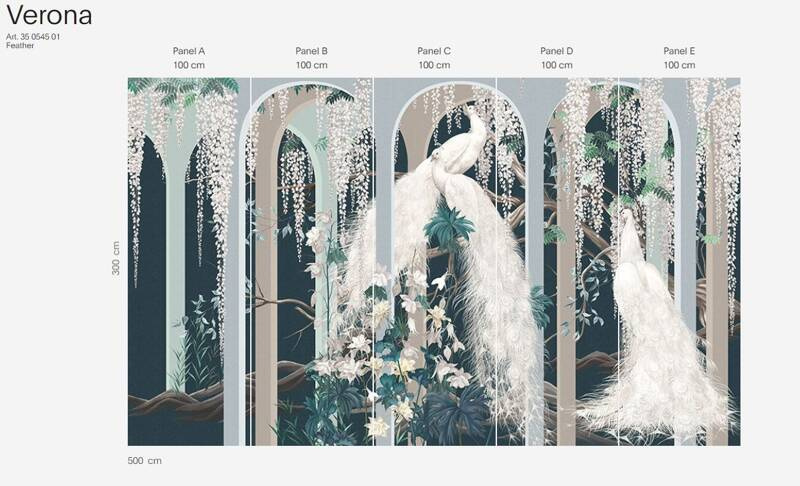 Głównym motywem tapety są kwiaty, gałęzie i białe pawie. Całość wzoru tworzy spójną, harmonijną kompozycję.