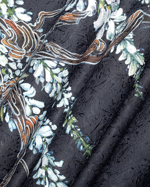 Głównym motywem tapety są kwiaty na ciemnym tle. Całość wzoru tworzy spójną, harmonijną kompozycję.