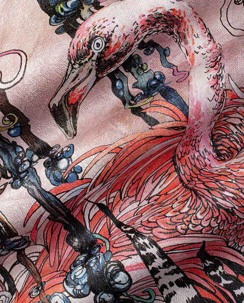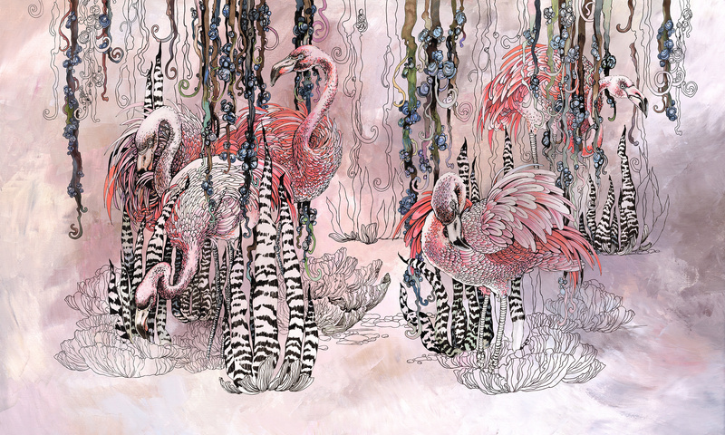 Głównym motywem tapety są flamingi na tle egzotycznych liści. Całość wzoru tworzy spójną, harmonijną kompozycję.