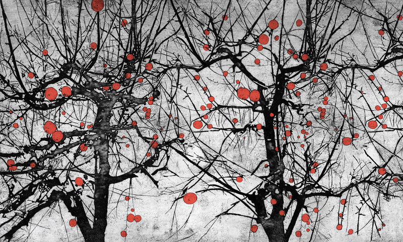 Głównym motywem tapety są drzewa na szarym tle. Całość wzoru tworzy spójną, harmonijną kompozycję.