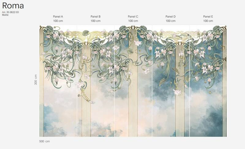 Murale marki Wonderwall sprzedajemy w rolkach o standardowych wymiarach: 100 cm x 300 cm. Jeśli wysokość waszego pomieszczenia jest mniejsza niż 3 metry, wówczas nadmiar tapety należy w odpowiednim miejscu odciąć. Na pełny wzór składa się pięć rolek: a, b, c, d i e. Można wybrać konkretne rolki dopasowując tapetę do swojego wnętrza. Lub można przygotować mural pod konkretny wymiar. W tym celu prosimy o kontakt pod mail sklep@iguane.pl