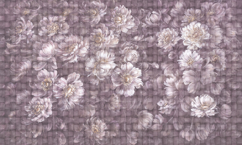 Głównym motywem tapety są kwiaty na tle imitującym plecionkę. Całość wzoru tworzy spójną, harmonijną kompozycję.