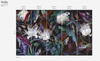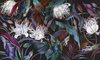 Głównym motywem tapety są egzotyczne kwiaty i kolorowe liście na kontrastowym ciemnym tle. Całość wzoru tworzy spójną, harmonijną kompozycję.
