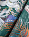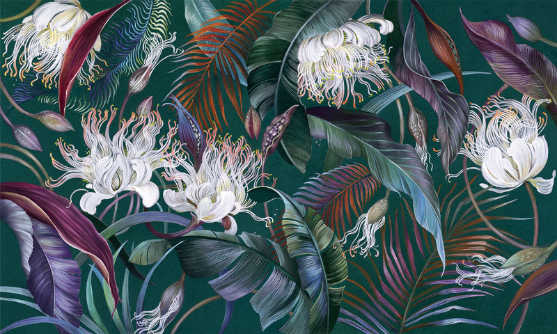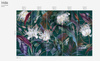Głównym motywem tapety są egzotyczne kwiaty i kolorowe liście na kontrastowym ciemnym tle. Całość wzoru tworzy spójną, harmonijną kompozycję.