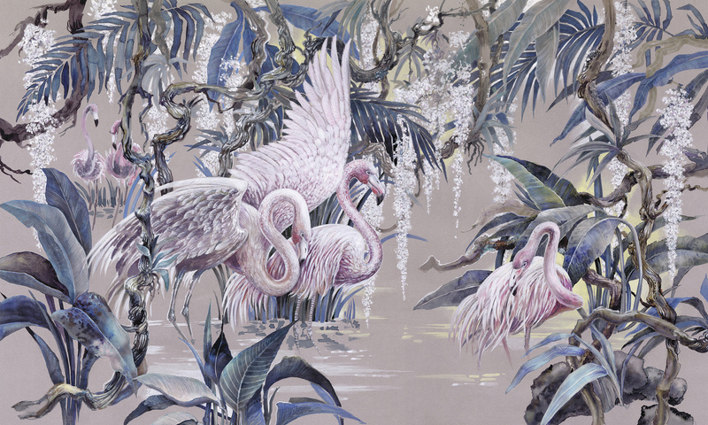 Głównym motywem tapety są flamingi na tle liści i drzew. Całość wzoru tworzy spójną, harmonijną kompozycję.