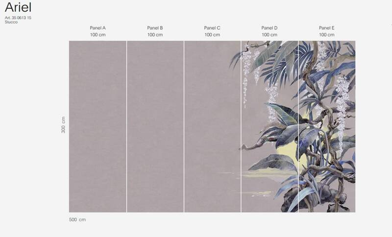 Murale marki Wonderwall sprzedajemy w rolkach o standardowych wymiarach: 100 cm x 300 cm. Jeśli wysokość waszego pomieszczenia jest mniejsza niż 3 metry, wówczas nadmiar tapety należy w odpowiednim miejscu odciąć. Na pełny wzór składa się pięć rolek: a, b, c, d i e. Można wybrać konkretne rolki dopasowując tapetę do swojego wnętrza. Lub można przygotować mural pod konkretny wymiar. W tym celu prosimy o kontakt pod mail sklep@iguane.pl