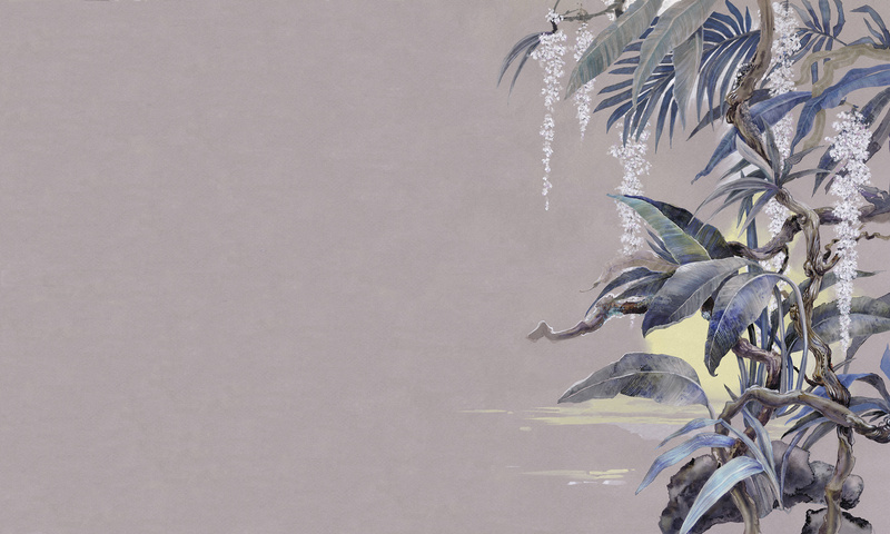 Głównym motywem tapety są liście przysłaniające słoneczny horyzont. Całość wzoru tworzy spójną, harmonijną kompozycję.