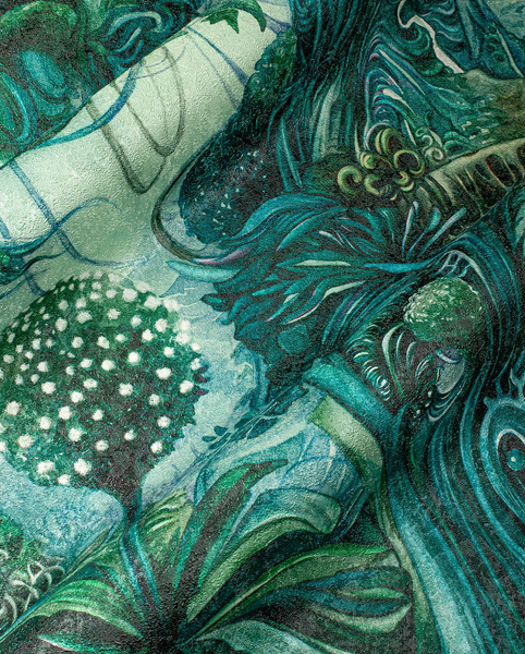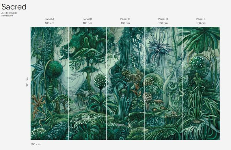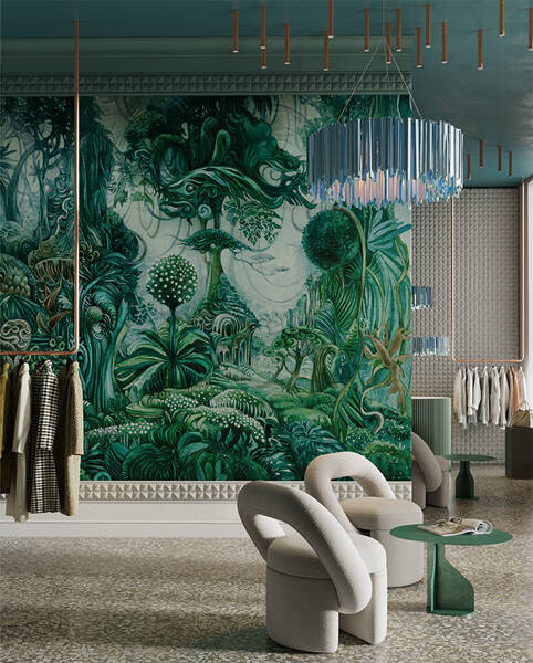 Głównym motywem tapety jest mistyczny las w intensywnych kolorach. Całość wzoru tworzy spójną, harmonijną kompozycję.