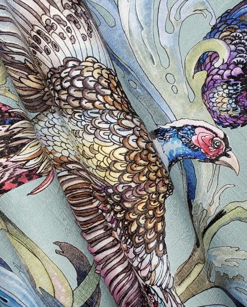 Głównym motywem tapety są bażanty. Całość wzoru tworzy spójną, harmonijną kompozycję.