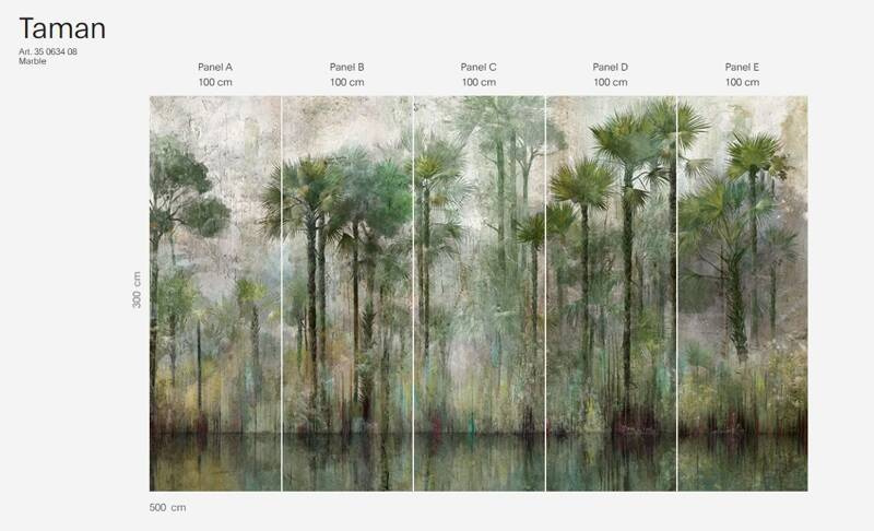 Głównym motywem tapety jest las. Całość wzoru tworzy spójną, harmonijną kompozycję.
