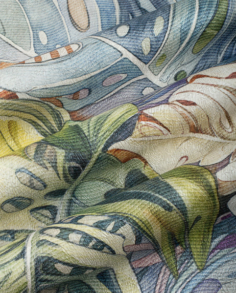 Głównym motywem tapety są liście monstery. Całość wzoru tworzy spójną, harmonijną kompozycję.