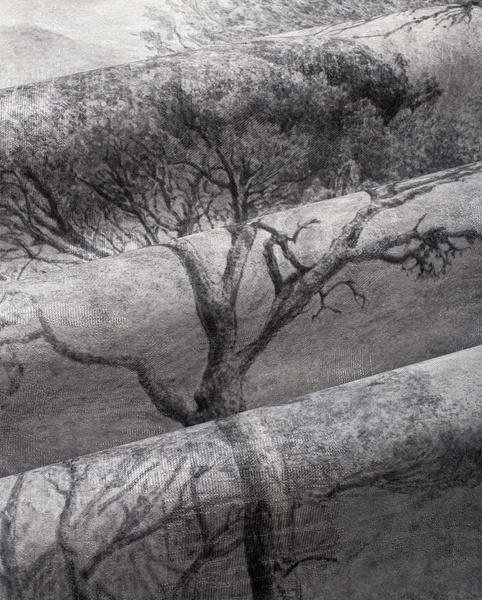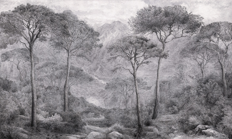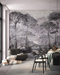 Głównym motywem tapety jest las w stylu vintage. Całość wzoru tworzy spójną, harmonijną kompozycję.
