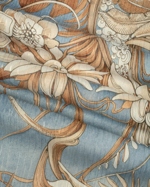 Głównym motywem tapety są egzotyczne kwiaty. Całość wzoru tworzy spójną, harmonijną kompozycję.