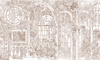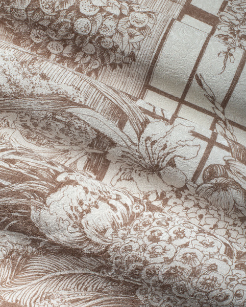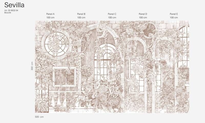 Głównym motywem tapety są łuki i okna przyozdobione bujnymi kwiatami. Całość wzoru tworzy spójną, harmonijną kompozycję.