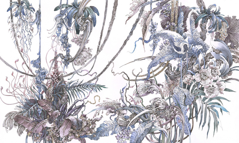 Głównym motywem tapety są egzotyczne kwiaty. Całość wzoru tworzy spójną, harmonijną kompozycję.