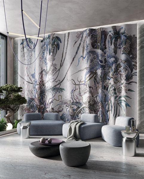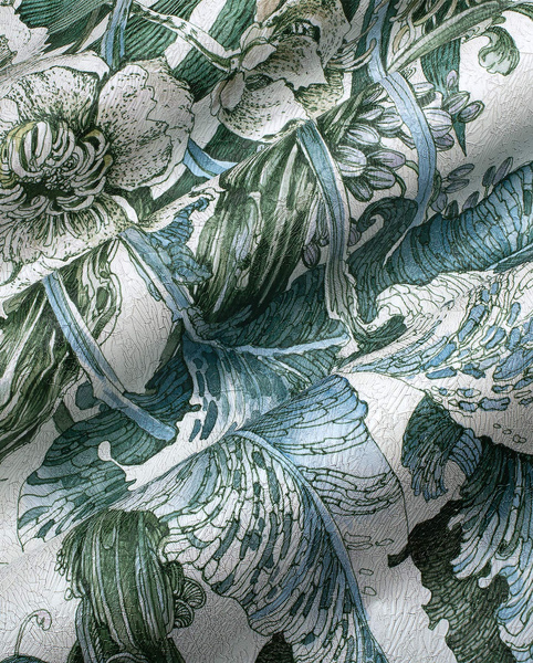 Głównym motywem tapety są egzotyczne kwiaty. Całość wzoru tworzy spójną, harmonijną kompozycję.