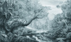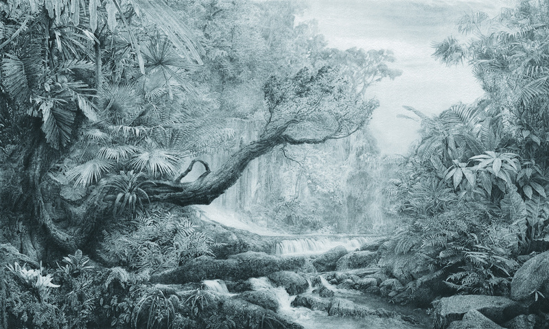 Głównym motywem tapety jest wodospad położony w sercu dżungli. Całość wzoru tworzy spójną, harmonijną kompozycję.