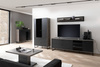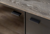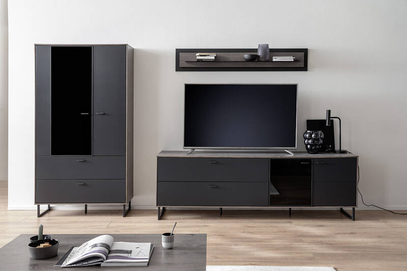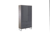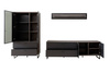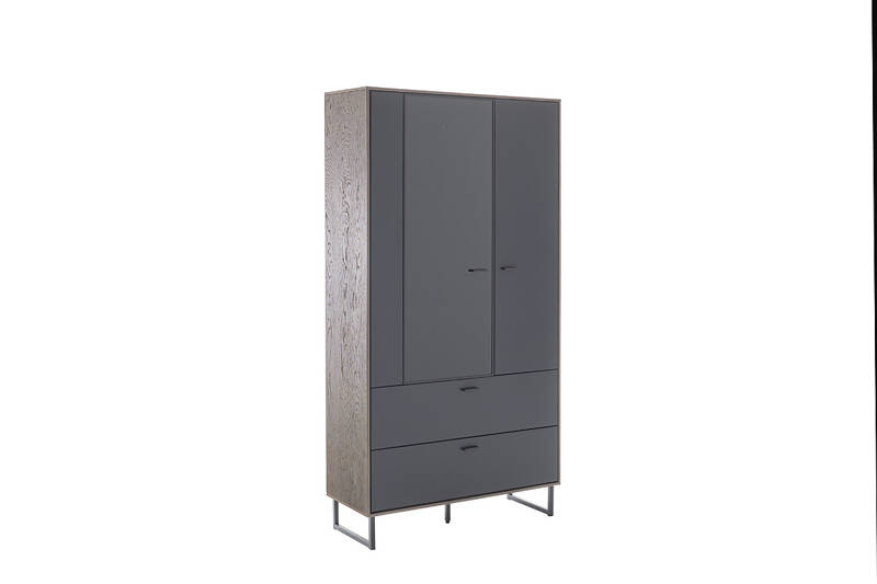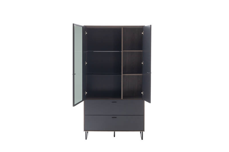 Fronty wykonane z MDF i polakierowane na ciemny szary mat. Drzwi z czarnym szkłem mają ramki z aluminium lakierowane na czarnoszary mat. Korpus na zewnątrz jest fornirowany okleiną dębową w odcieniu vulcano.