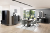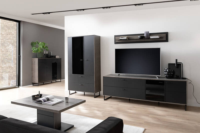 Zestaw mebli Venezia to wyrafinowane i eleganckie dopełnienie wnętrza. Ciemny fornir dębowy świetnie komponuje się z ciemnym szarym lakierem oraz przyciemnionym szkłem. Proste bryły ale o bardzo wyważonych proporcjach i starannym wykończeniu tworzą niebanalne i niezwykłe meble.