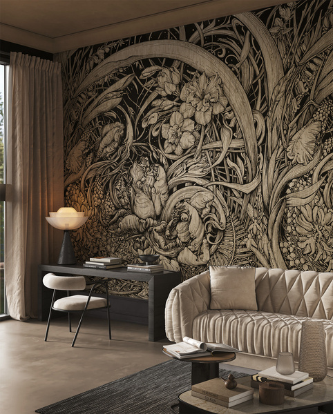 Głównym motywem tapety są kwiaty. Całość wzoru tworzy spójną, harmonijną kompozycję.
