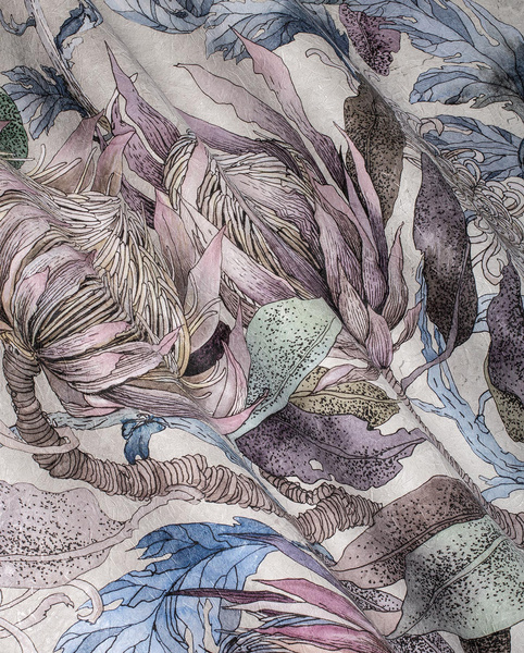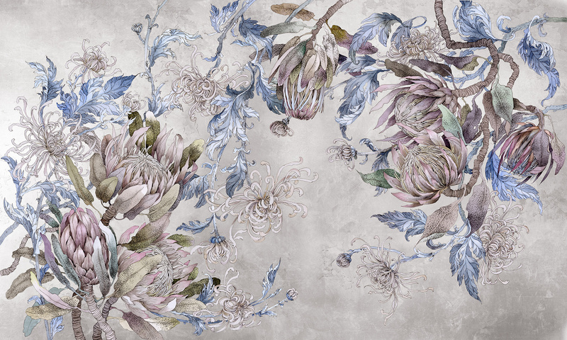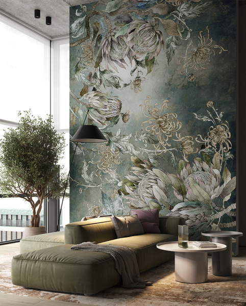 Głównym motywem tapety są okazałe kwiaty i liście. Całość wzoru tworzy spójną, harmonijną kompozycję.
