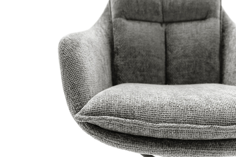 Krzesło posiada 4 skośne stabilne nogi wykonane z metalu, lakierowane na czarny mat, a wykonane jest w tkaninie z grubym, ciekawym splotem.
