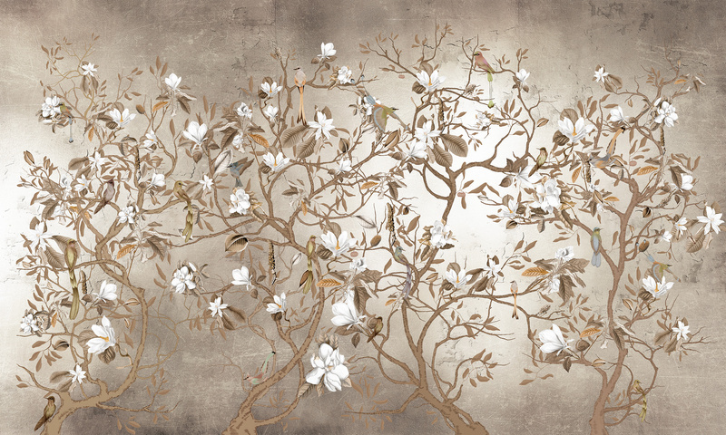 Głównym motywem tapety są kwitnące drzewa z siedzącymi na ich gałęziach ptaszkami. Całość wzoru tworzy spójną, harmonijną kompozycję.