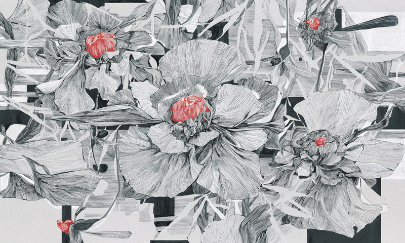Głównym motywem tapety są duże rysunkowe kwiaty. Całość wzoru tworzy spójną, harmonijną kompozycję.