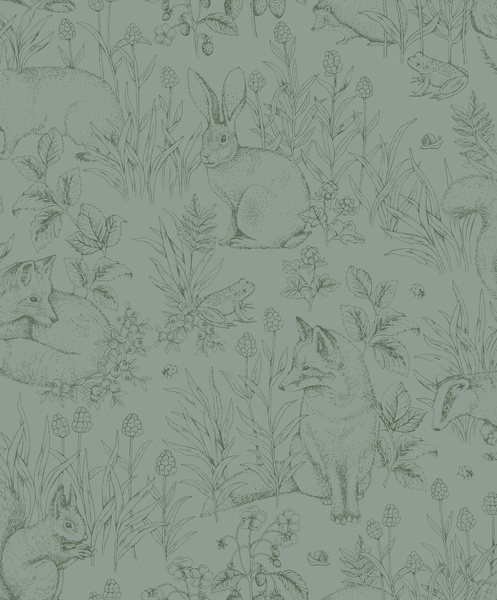 Tapeta dla dzieci Leśni Przyjaciele, przyciągająca głęboką a zarazem neutralną zielenią, oddaje ducha radosnego i przyjaznego lasu. Zawiera misterne ilustracje przedstawiające zające, lisy i żaby ukrywające się wśród roślinności, tworzące delikatną dekorację na ścianie.