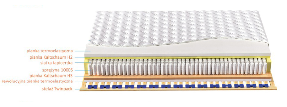 Wkład materaca stanowią sprężyny woreczkowe wykonane z wysokogatunkowego drutu. Znajdują się one w oddzielnych kieszonkach zwiększając niezależność pracy pojedynczych sprężyn, a tym samym poprawiając elastyczność materaca. Tego typu budowa pozwala przybrać kręgosłupowi naturalny kształt w postaci litery \"S\" i zapewnia tym samym bardzo wysoki komfort spania. W materacu Laguna 1000 S o wymiarach 140x200 cm znajduje się 1344 sprężyny. Wkład sprężynowy obłożony jest obustronnie siatką tapicerską. Z jednej strony występuje 20mm pianka Kaltchaum H3 oraz rewolucyjna, antybakteryjna i nie pozwalająca na rozwój roztoczy pianka termoelastyczna o doskonałej reakcji nacisku o wysokości 40 mm (80kg/m3). Pianka ta reaguje na temperaturę i ciężar ciała. Staje się bardziej miękka, gdzie ciało styka się z powierzchnią materaca. Z drugiej strony występuje pianka Kaltschaum H2 oraz standardowa pianka termoelastyczna o grubości 40 mm (45kg/m3).