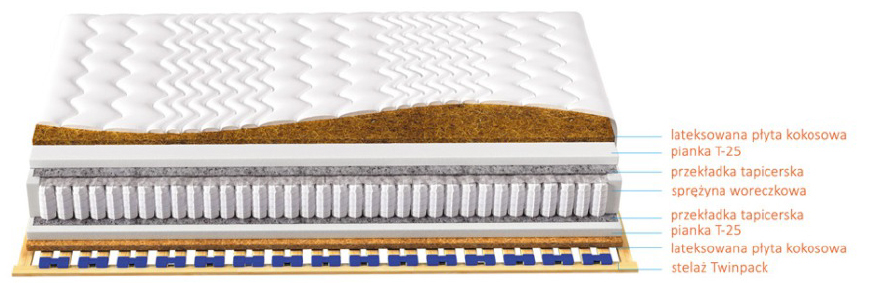 Wkład ze sprężyn woreczkowych, z wysokogatunkowego drutu, obłożony jest obustronnie przekładką tapicerską i pianką poliuretanową o zwiększonej sprężystości oraz lateksowaną płytą kokosu.
