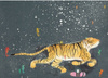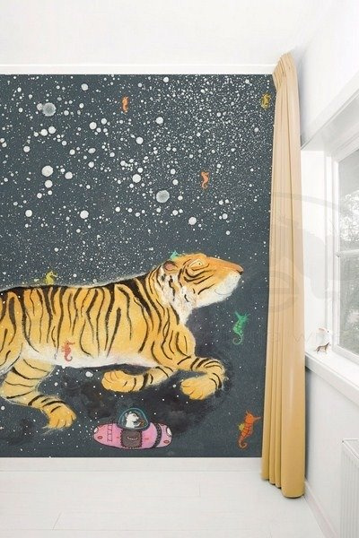 Fototapeta dziecięca Smiling Tiger autorstwa Alice Hoogstad. Wesoła i kolorowa tapeta z motywem biegnącego wśród gwiazd tygrysa.